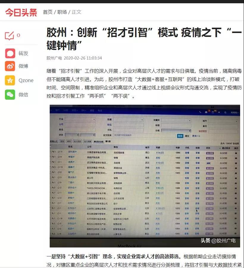 为帮助胶州企业做好疫情特殊时期的人才招聘工作,近日,青岛胶州市人力资源和社会保障局深入落实青岛市政府支持中小企业保经营稳发展18条政策精神,努力实现疫情防控与“招才引智”两手抓、两不误,联合云智咨询猎头公司,打造“大数据+客服+互联网”的线上洽谈新模式,打破时间、空间限制,精准组织企业和高层次人才通过线上视频会议形式沟通交流,助力引才,共克时艰!